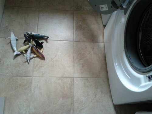 Yes, that is a pile of plastic sea mammals in front of the washer.
